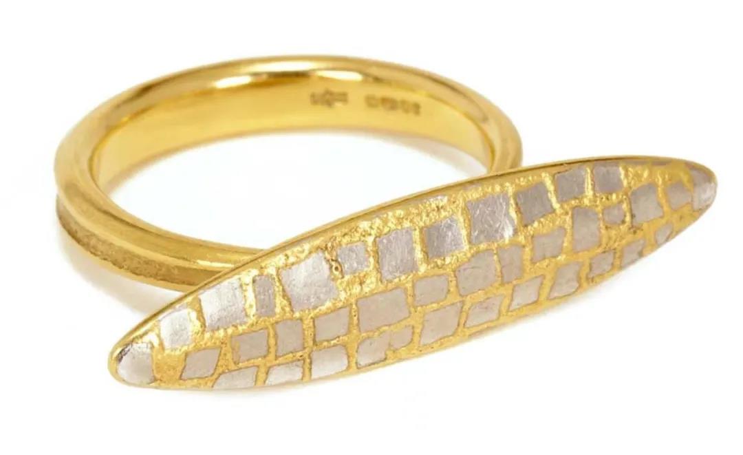 “我也對內、外平面之間對話的潛力感興趣,在嚴格劃定的邊緣內,隨機圖案處于緊張狀態,以及所有這些因素的對比與和諧所創造的視覺動態。從技術上講,我一直在嘗試擴大黃金和鉑金融合的可能性,使用鉑金紗布、網眼布、破損碎片、鑲嵌物、金屬絲和金粉來創造各種表面,從中我構建了我的珠寶。在制作之前,我很少畫一幅作品,我更喜歡直接在金屬中創作,這樣我就可以敞開心扉,接受各種可能性,避免在完成一幅作品之前固定任何細節。”