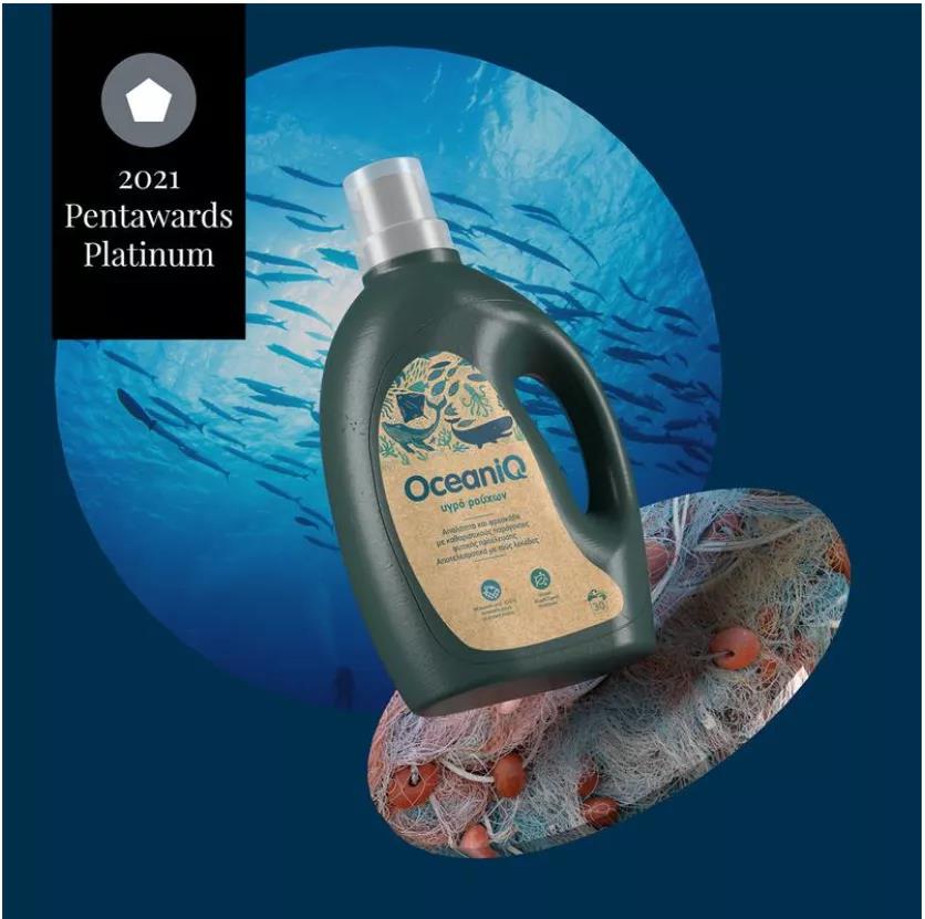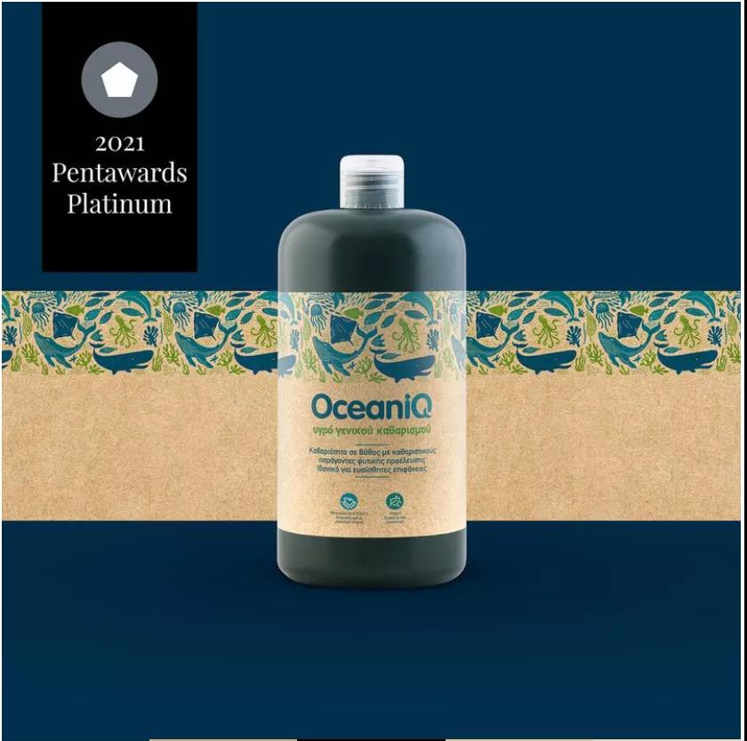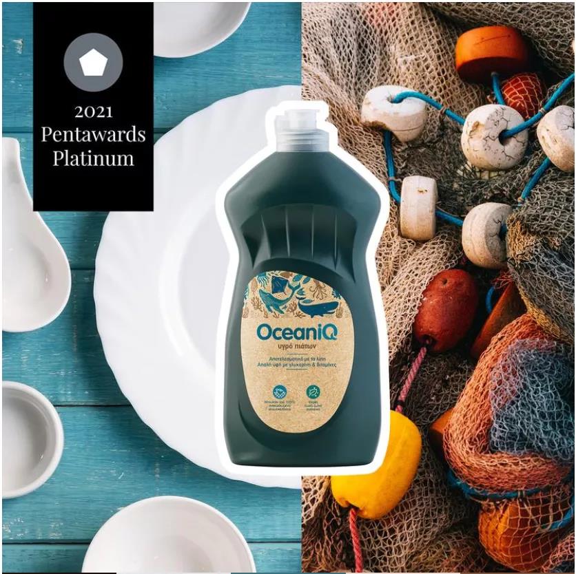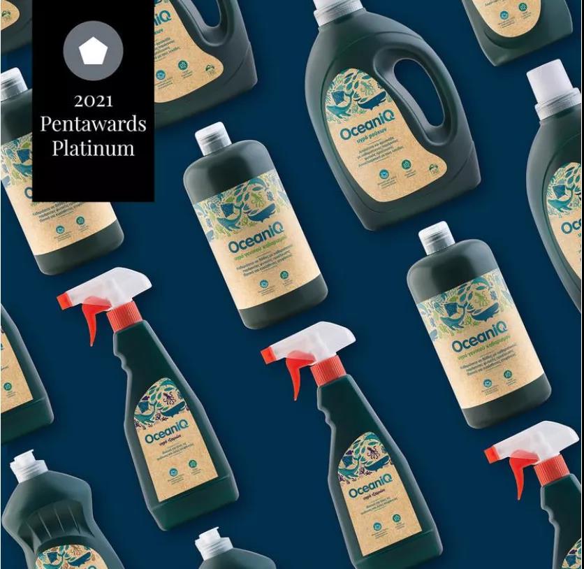 希臘設計公司2Yolk為希臘超級市場商店Alpha Beta打造的純素家庭護理洗滌劑的品牌——OceaniQ(“Oceanic”和“IQ”結合)獲得了Pentaward可持續設計類鉑金獎。