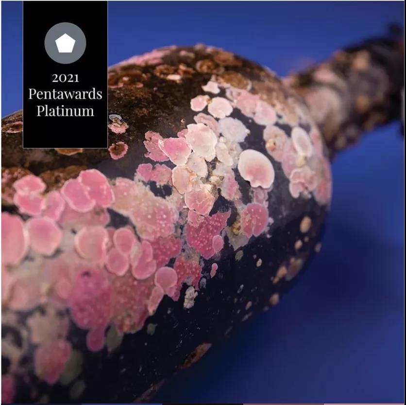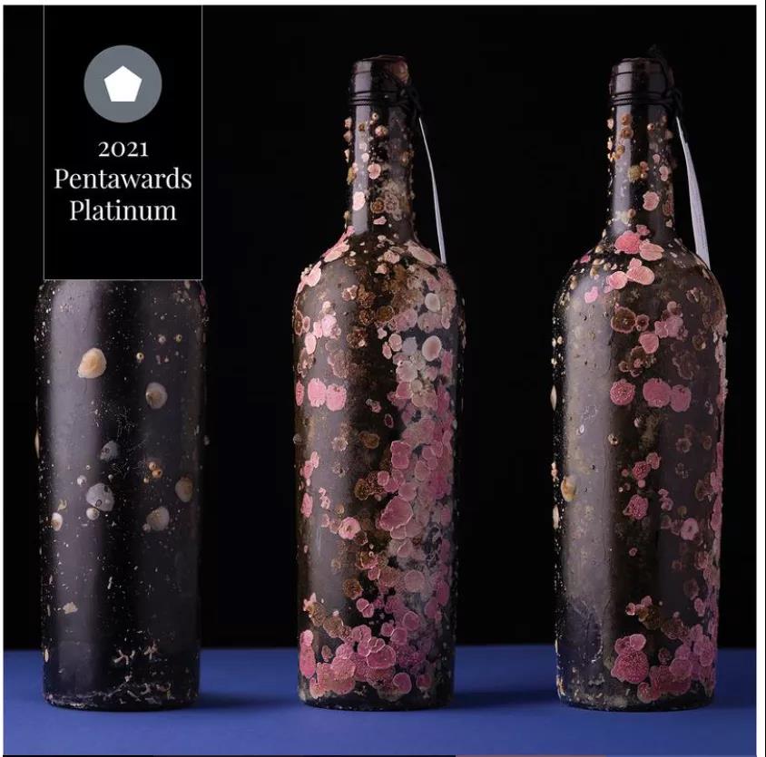Vinho do Mar的設計獲得了飲料類的鉑金獎。這個設計的特別之處在于,設計師將瓶子浸入大西洋深處葡萄牙阿連特茹海岸的海水10個月。這期間,葡萄酒在獨特的溫度和濕度條件下陳釀著,同時瓶身上的圖形也伴隨著時間跟海水的影響,“生長”出了令人驚艷的美麗圖案,可以說“大海”是這個產品的創造師。
