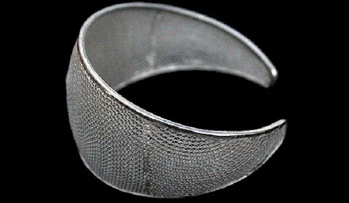 鏨刻工藝的所形成的肌理具有極強的裝飾性。我們知道,鏨刻工藝包括鏨花工藝和雕金工藝。鏨花工藝就是在金屬上借助錘敲來完成的工藝,鋒利的鏨子在金屬片上鏨出凹陷的花紋圖案,鏨子的形狀決定了肌理的形狀,隨著錘敲和鏨刻的次數不斷增多,所形成的肌理也不斷增多。應該說,鏨花工藝形成的肌理具有民族特性和地區特性。