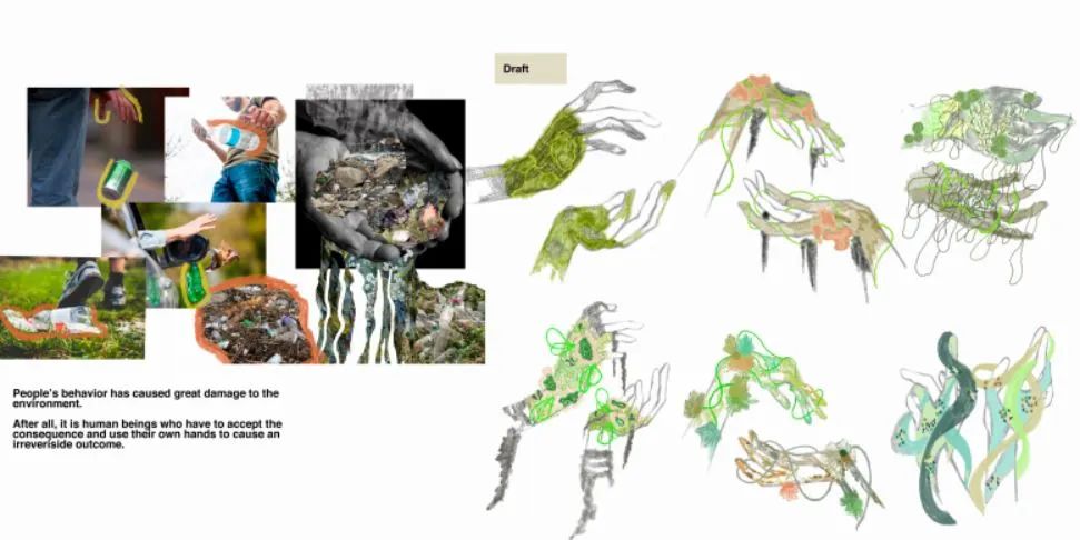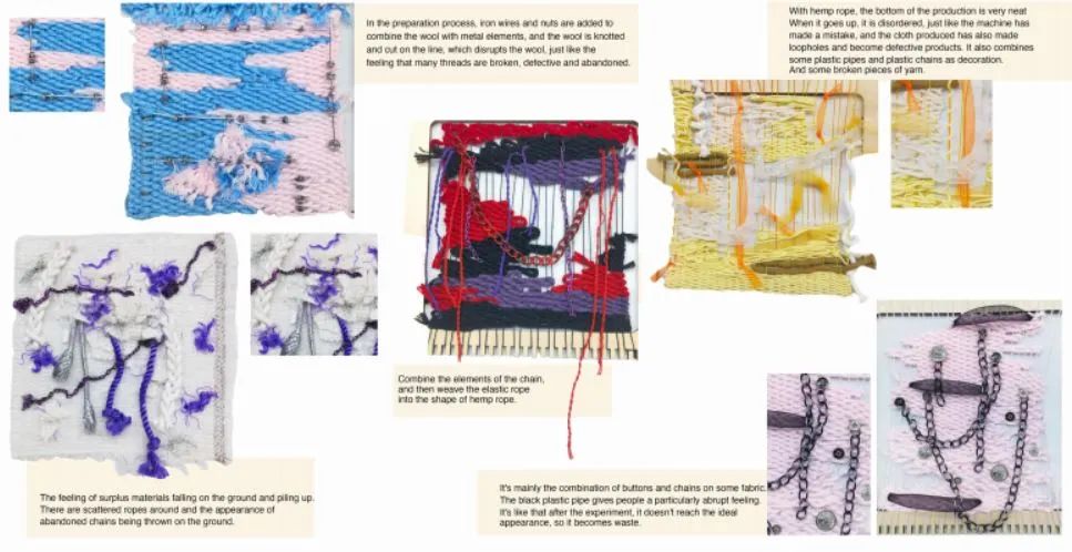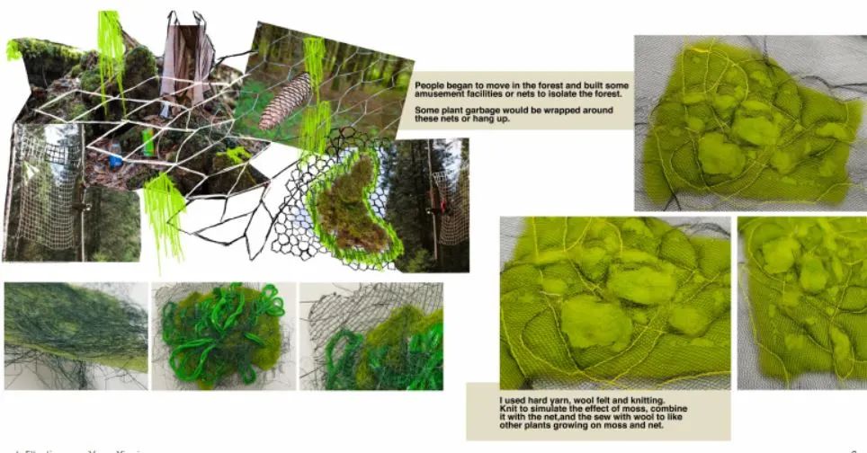 我用塑料材質(zhì)(塑料管、泡泡紙)、金素材質(zhì)和網(wǎng)狀材料來代表污染物,給他們?nèi)旧靡恍┟€、碎布、紗線、毛氈來表現(xiàn)植物的質(zhì)感,將這兩種反差很大的材質(zhì)通過編織、縫線等等的方式結(jié)合到一起,來體現(xiàn)我的主題,污染和自然環(huán)境互相滲透。