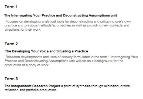 大家在申請院校的時候可以發現,到了MA階段,學校更多要求大家作為一個專業的藝術家身份去要求自己,而不僅僅是學生,我們需要知道自己的目標和方向。