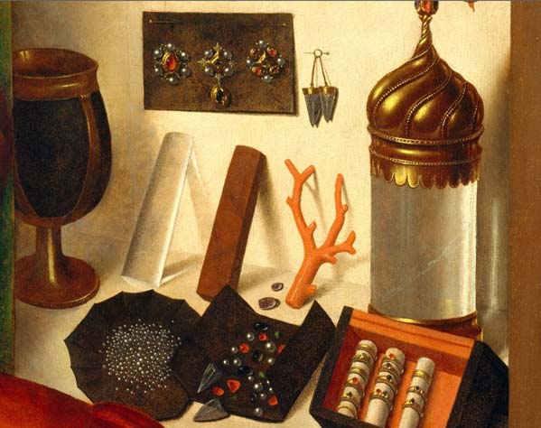 在上面的油畫作品中,我們可以從男客戶的帽子與金匠背后的首飾樣品展示上,看出首飾設(shè)計的主要類型。即環(huán)繞一個大的主石使用黃金來做鑲嵌。雖然寶石資源豐富,但是當(dāng)時人們更加認(rèn)為彩色寶石是黃金的裝飾品與象征財富能力的體現(xiàn)。