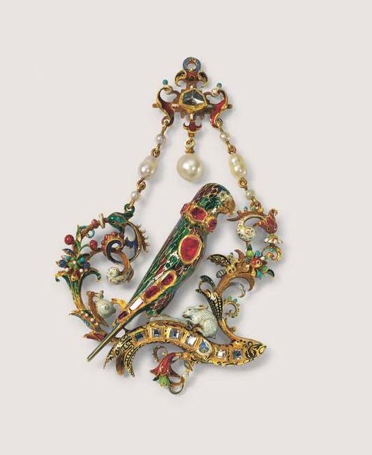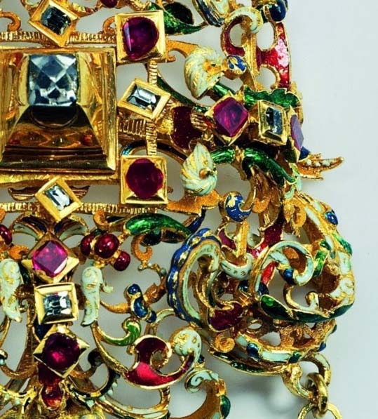 這件造型結(jié)構(gòu)非常復(fù)雜的吊墜,以那一時期常見的卷曲的植物枝干效果為造型,使用彩色寶石與彩色琺瑯來達(dá)到創(chuàng)作上的和諧。該吊墜的制作時期雖然為藝術(shù)史上的風(fēng)格主義時期,但是首飾的制作風(fēng)格變化遠(yuǎn)不如繪畫或者雕塑來的迅捷,因此在這件吊墜上我們依然可以感受到文藝復(fù)興時期對于和諧之美的追求。從穩(wěn)定且對稱的基礎(chǔ)造型,寶石與琺瑯交錯創(chuàng)造的濃烈色彩對比,中性圍繞式的布局構(gòu)建,無不展示了當(dāng)時工匠精湛能力。部分也歸功于當(dāng)時已經(jīng)形成了具有學(xué)校制度與體系的專業(yè)的手工藝培訓(xùn)工作室。