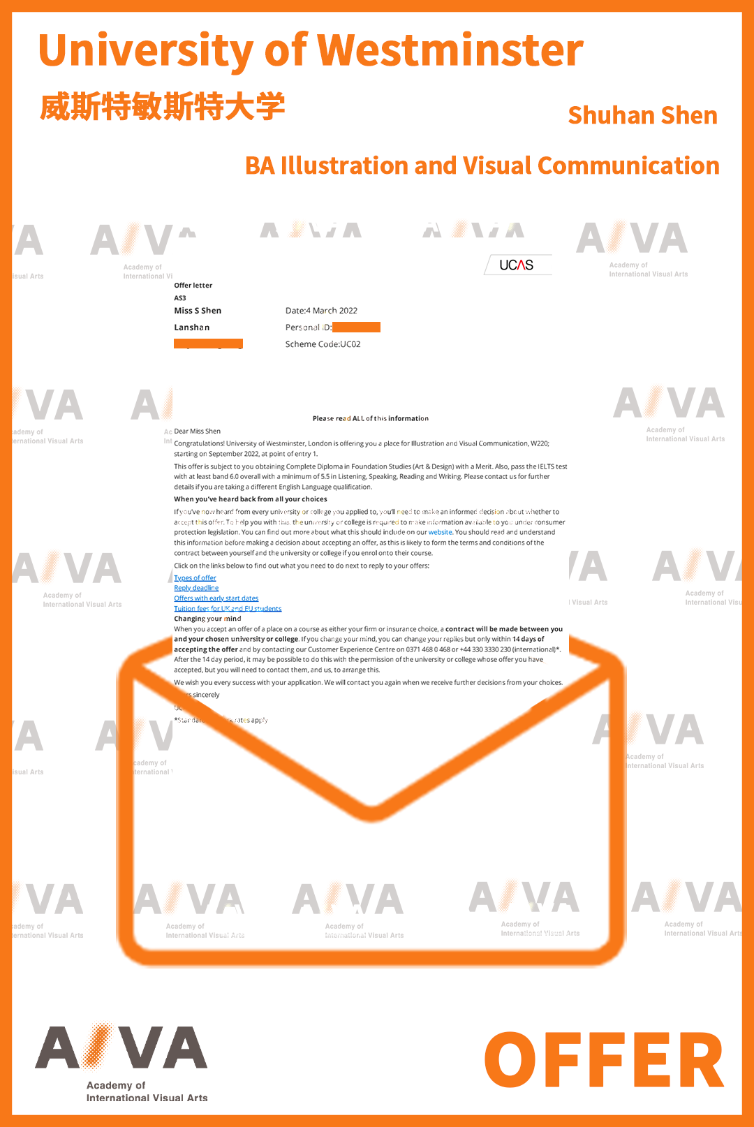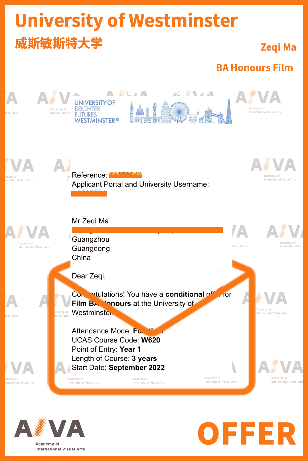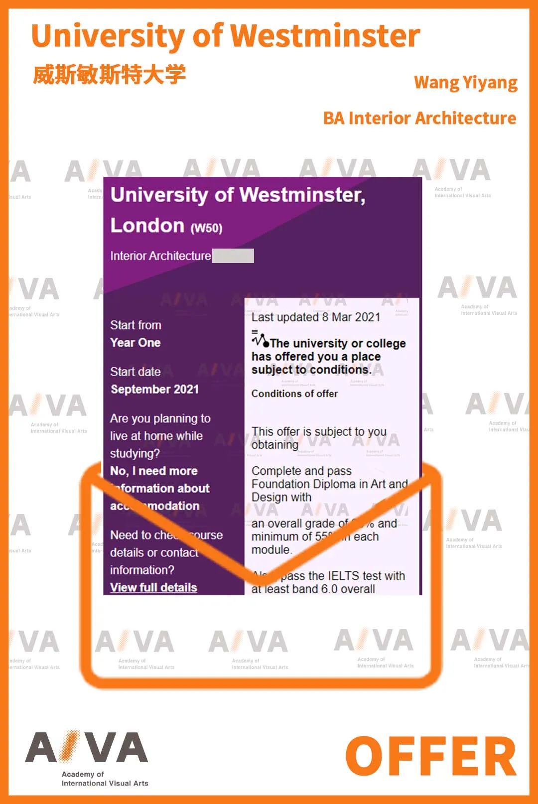 AIVA憑借豐富的藝術留學申請經驗與過硬的教學水準,多年來輔導眾多學生收獲了威斯敏斯特大學建筑、電影、時尚管理、插畫設計、室內等各個優勢專業本碩Offer。他們以扎實的基本功和對專業的深刻理解,在這所一流的綜合院校繼續深造,實現藝術夢想: