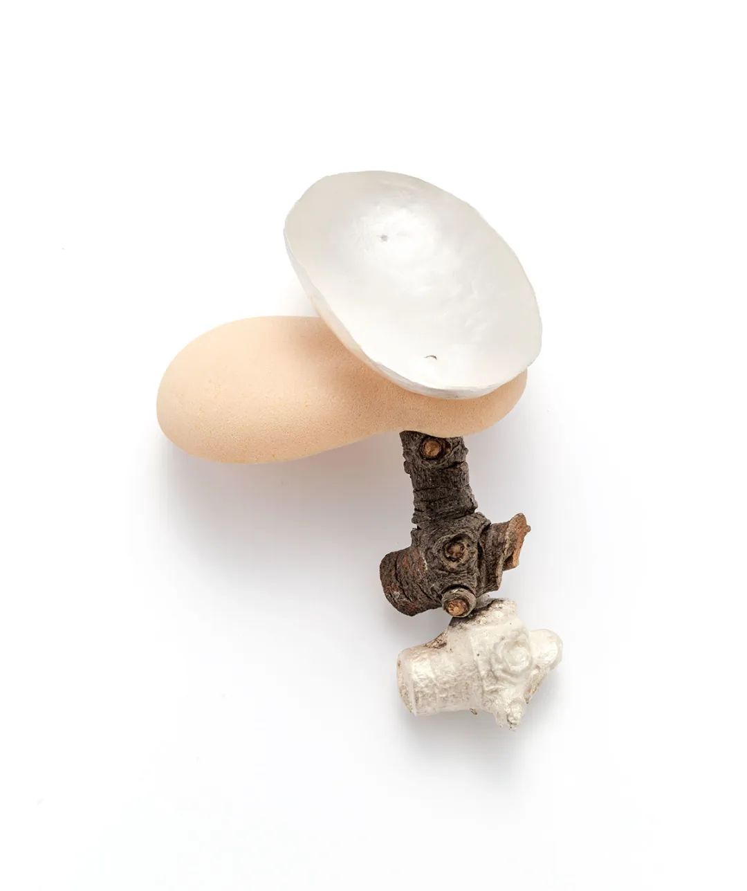 從本質(zhì)上講,Moty 精心制作且耗時的過程始于尋找合適的石頭——石匠已經(jīng)對其進行了改造——然后從那里開始“建造”。藝術(shù)家參與到選擇石頭的色調(diào)、形狀和特征。與其他形式的首飾相比,她更喜歡胸針,她說:“胸針不需要佩戴就可以完整……不必將其貼合身體……我可以專注于雕塑方面。”