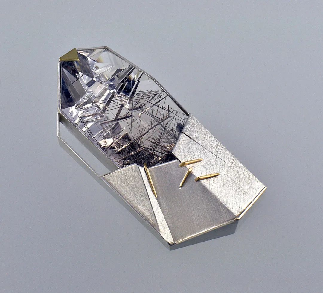 無論是參考風景還是建筑或兩者兼而有之,金屬匠 Eleanor Moty 創(chuàng)造出獨特的首飾,詩意地圍繞著佩戴者和觀眾。Moty 在 1960 年代和 1970 年代憑借在裝飾中使用了尖端的制造技術(shù),例如電鍍和光刻,首次獲得認可。在過去幾十年中,她將重點轉(zhuǎn)向在作品中加入寶石,她創(chuàng)作的大型胸針體現(xiàn)了與石英石“線性圖像”的對話。