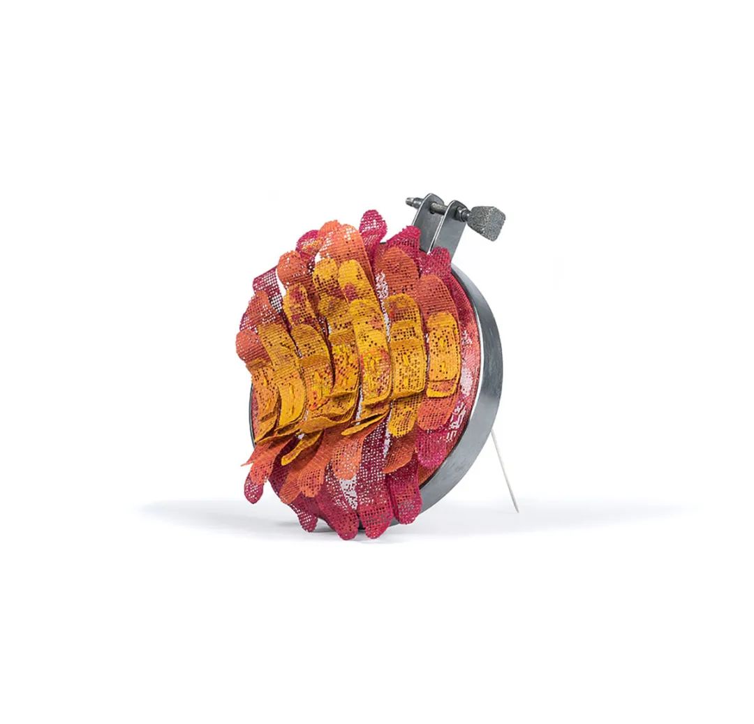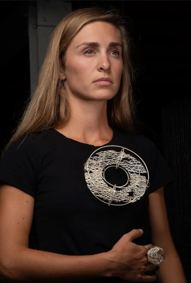 Feulner 專注于圓形來創(chuàng)作項鏈和胸針,這些作品在本次展覽中相得益彰。在近期的探索中,她手鋸了金、銀、青銅和粉末涂層鋼,以創(chuàng)造出不同表面紋理的形狀及其無數(shù)次迭代。據(jù)這位藝術(shù)家說,“循環(huán)是對一種形式及其運動的無聲關(guān)注——圓圈……尋找它的重復(fù)和旋轉(zhuǎn)以創(chuàng)造節(jié)奏和平衡,并找到一條沒有明顯開始和結(jié)束的線條。”