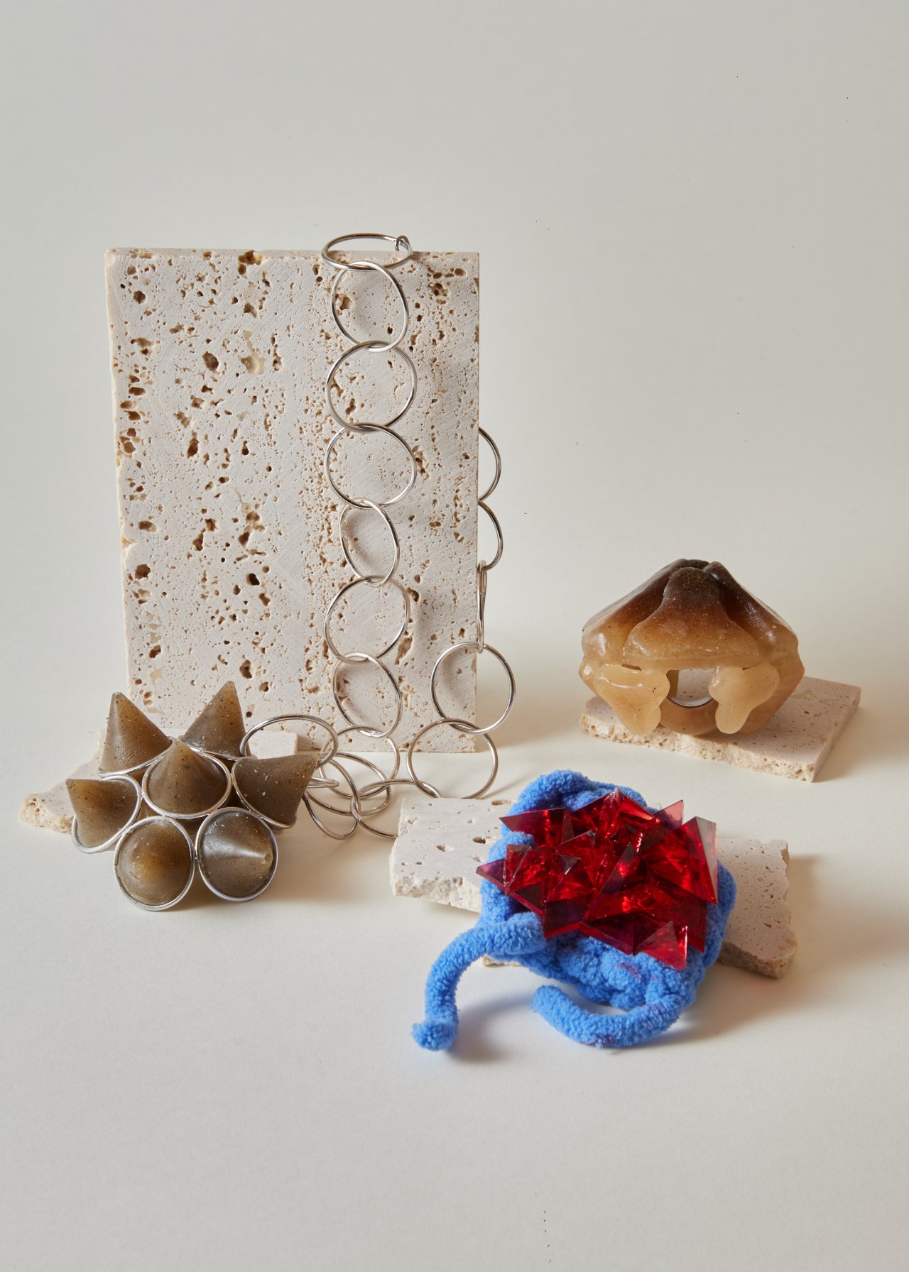 我運(yùn)用新型材料結(jié)合首飾語(yǔ)言進(jìn)行表達(dá)。為了制作爺爺粗糙的肌理,我將鹵肉料磨成粉末,與石膏粉混合并風(fēng)干,營(yíng)造出粗糙的質(zhì)感。奶奶又干又糙的肌理則是通過(guò)融化吉利丁片,混合啫喱水和肥皂水制作泡泡,并在泡泡風(fēng)干后觸摸起來(lái)呈現(xiàn)奶奶干糙的雙手感覺(jué)。至于我的肌理,我使用甘草粉混合硅膠,賦予作品柔韌和光滑的質(zhì)感。我從這三種主要材料中提取各自的色彩板:我是清新的綠色,奶奶是憤怒的紅色和冷靜的藍(lán)色,爺爺是溫暖沉穩(wěn)的黃棕色。接著,根據(jù)每個(gè)人的性格特點(diǎn),我選取了相應(yīng)的形狀:我是圓錐形,象征著對(duì)陌生人的警惕;奶奶是三角形,代表她口是心非的個(gè)性;爺爺則是梯形,象征他為人正直。通過(guò)結(jié)合這些顏色、肌理和形狀,我創(chuàng)作出了最終的成品。