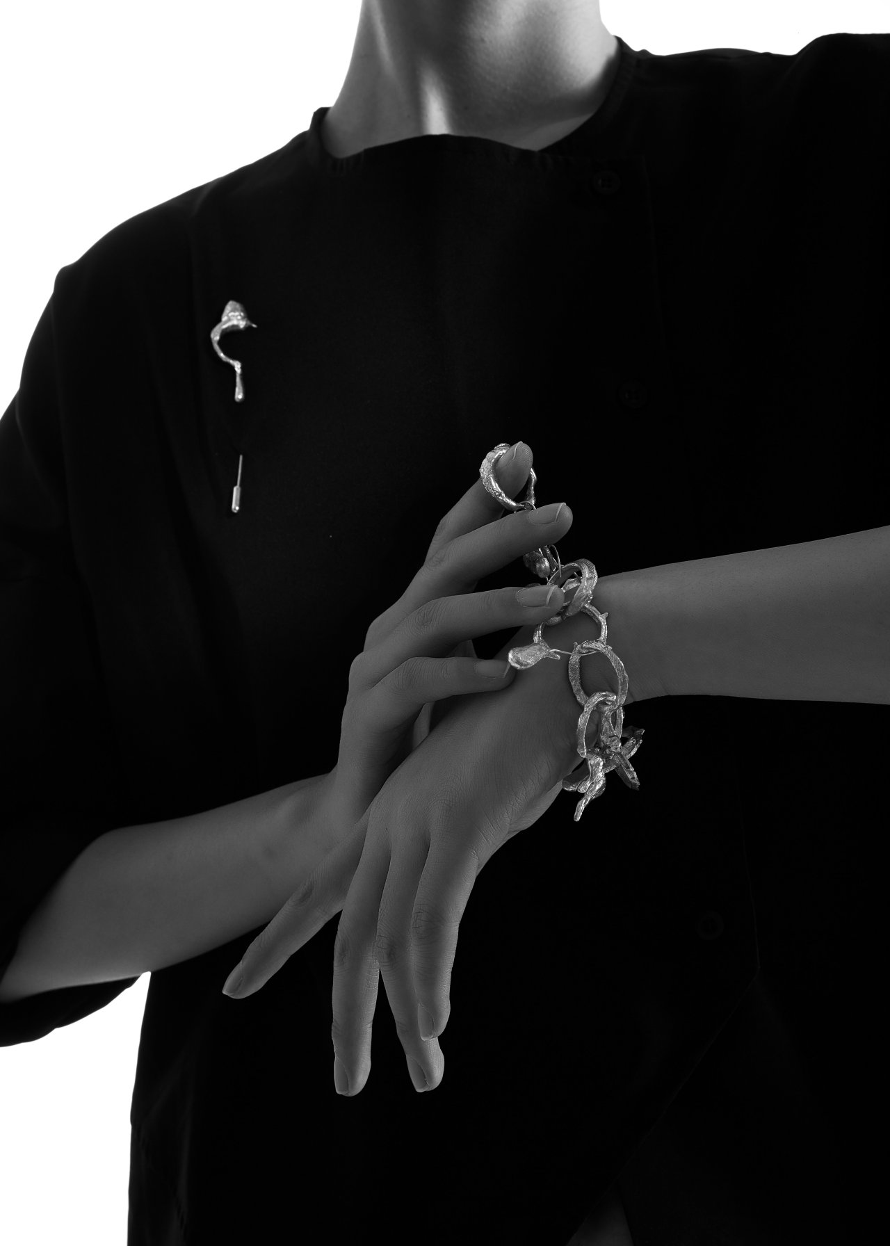 《戒指非戒指仍為戒指》系列展示了我作為一位注意力缺失障礙的首飾藝術家,如何創造和看待作品。除了成品,整個制作過程和副產品同樣重要。我采用墨魚骨鑄造法,刻意設計了一個變數多且重復性高的制作過程。由于高溫會損壞雕刻的圖案邊緣,我需要準備大量墨魚骨進行重復鑄造,這一過程迅速消磨我的注意力,導致出現許多意外。這些“失誤”被保留下來,用于進一步發展。