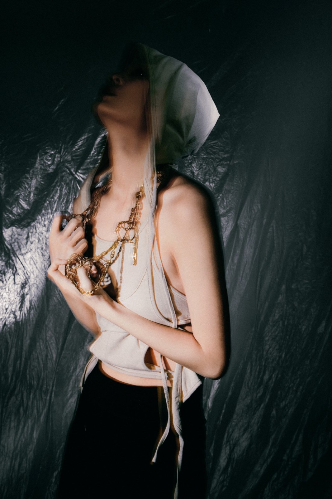 《鈴鼓》是一系列能隨著人體的運動而發(fā)出聲音的首飾。首飾和音樂有相似之處,都可以提高人們的精神滿足感和舒適感。受到中國傳統(tǒng)配飾步搖和禁步的啟發(fā),當(dāng)人佩戴它們行走時,配飾上的金玉相互碰撞會發(fā)出令人愉悅的聲音。于是我想通過人們不同的行為來探索人與首飾對象之間的關(guān)系,這可能會給觀眾帶來更有趣的穿著體驗和一種獨特的心理感受。