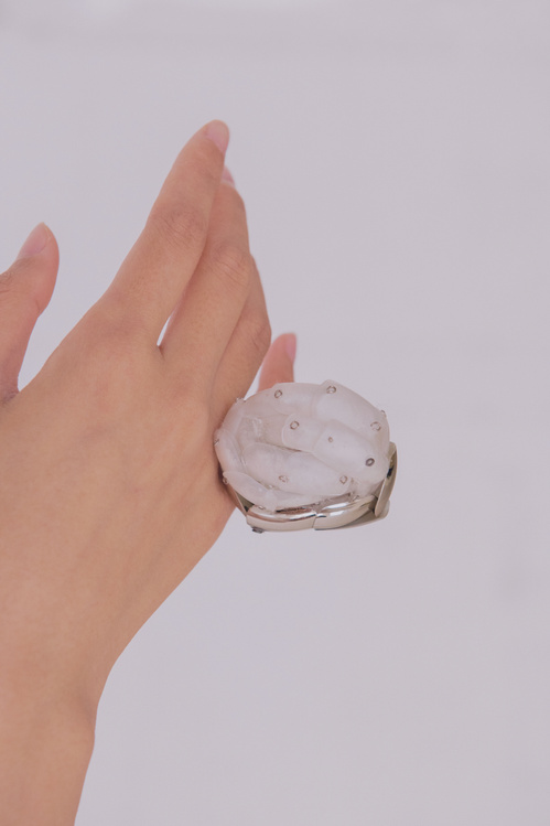 當代首飾的材料的不受限的,在我最近的一個項目里我探索了美甲片應用于首飾的可能性。美甲起初的目的就是為了吸引男性目光,在一部分人眼中,裸露的指甲如同素顏,無法面對公共場所的凝視。我將社交恐懼群體的心理視為一個容器,在從一些自然界現象中聯想到,他們其實就是一個“繭”,在每個“繭”中,你在創造屬于你自己的美麗,你不沖破它永遠不知道里面有什么東西,于是我嘗試用美甲的材料做一個素凈柔軟的繭型,利用顏色和材料質感的對比去表達每個人不同的個性和可能性,希望能鼓勵社交恐懼群體去展示自我。