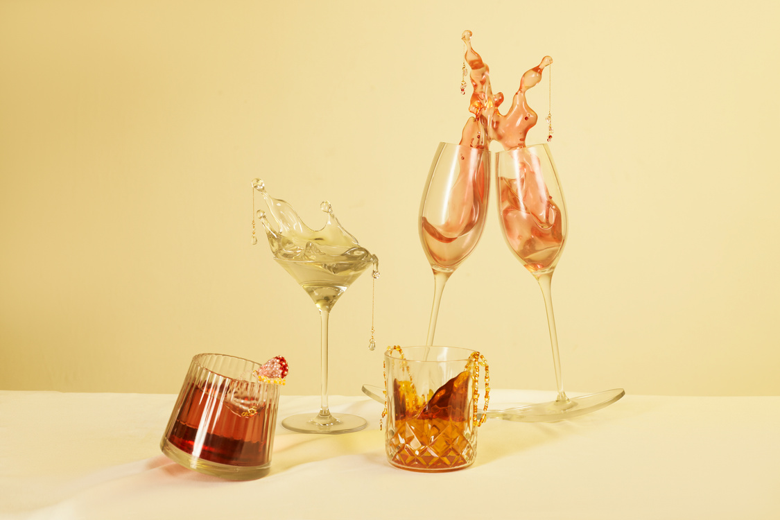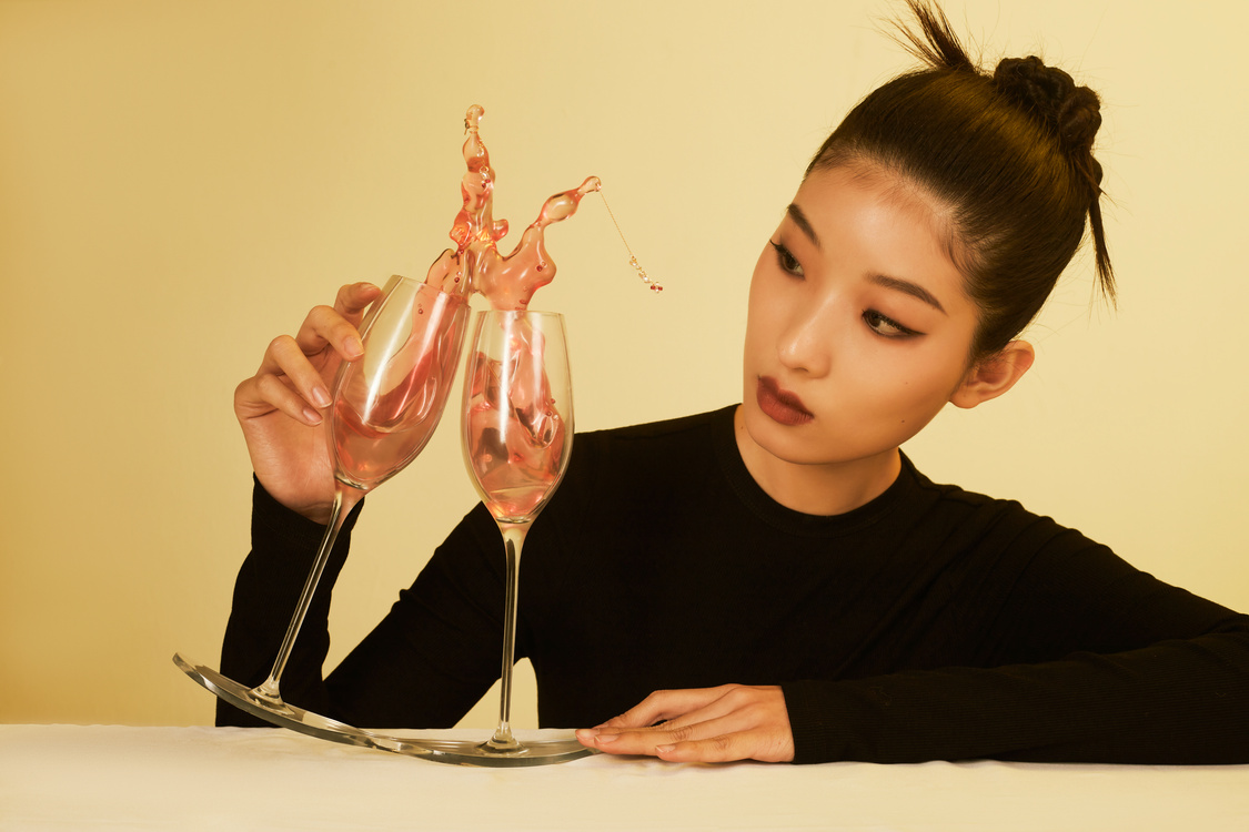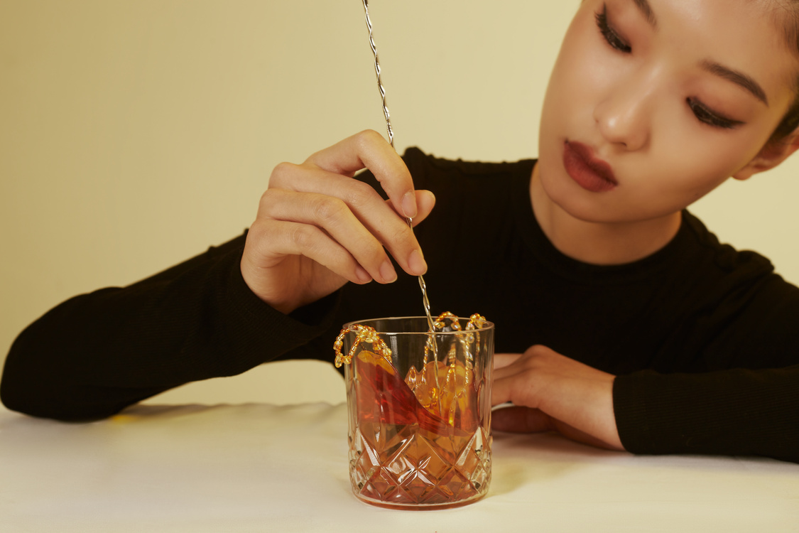 我的愛好之一是品嘗與調制雞尾酒。在喝酒和調酒的過程中,酒液往往處于不穩定的狀態,欣賞透明的酒液流動的場景,是調酒帶給我除了美味之外的另一種享受。作為一名首飾設計師,我將酒液飛濺的瞬間定格,并將其設計成首飾架和配套首飾。