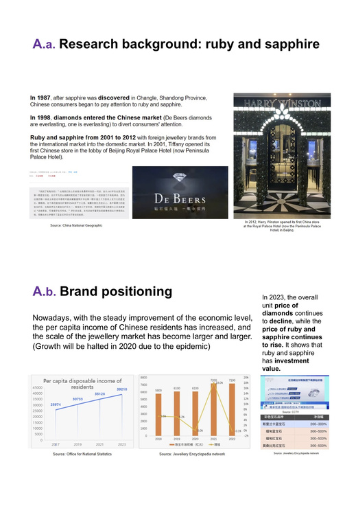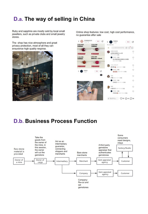 In the first project, I compared how Chinese jewelry sellers of different scales operate their businesses, including their product types, price ranges, and customer demographics. In the second project, I surveyed gemstone customers with a budget of approximately CNY 300,000. I collected information on the background history and trends of the gemstone market in China from the modern age, as well as the current status of gemstone trading both online and in physical stores, through interviews with buyers and sellers.