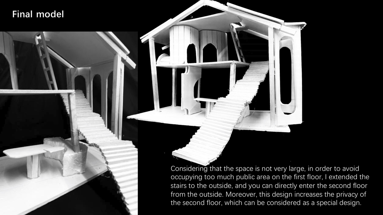 The design of <soft space>, the first project during the preparatory period, was inspired by Chiharu Shiota's style of using nets and wires in her art work. As a beginner, I built my understanding of space and architectural framework through hand movements and the folding and stretching of silk screens. Through the model, I expressed my concept of an artistic installation in the atrium area of a comprehensive business center. I hoped that it could be both practical and ornamental, so I designed part of it as a bench with irregular shapes, while the rear space was designed as a walking passage, reflecting my efforts to utilize the visual language- wrapping during the model making.