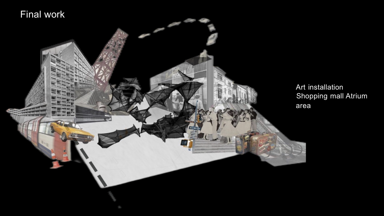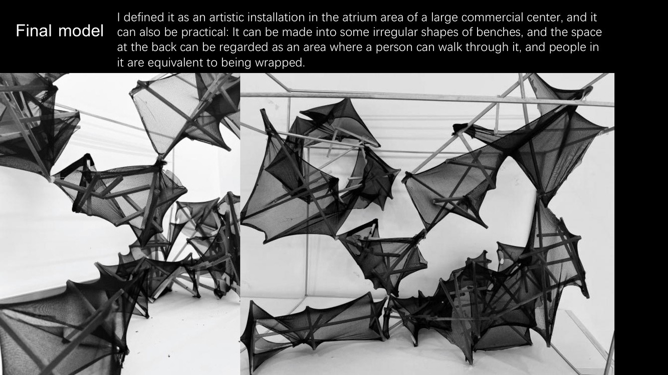預(yù)科期間的第一個(gè)項(xiàng)目《soft space》的設(shè)計(jì)靈感來(lái)自于鹽田千春作品中對(duì)于的網(wǎng)和線使用。作為初學(xué)者我通過(guò)手部動(dòng)作和絲網(wǎng)的翻折拉伸建立了對(duì)空間和建筑骨架的理解。通過(guò)模型構(gòu)想了一個(gè)綜合商業(yè)中心中庭區(qū)域的藝術(shù)的裝置我希望他可以兼具實(shí)用性和觀賞性,因此我將他的一部分設(shè)計(jì)成:可一些不規(guī)則形狀的長(zhǎng)凳,而后方空間設(shè)計(jì)為行走通道,體現(xiàn)了我在模型制作期間對(duì)包裹這一視覺(jué)語(yǔ)言的運(yùn)