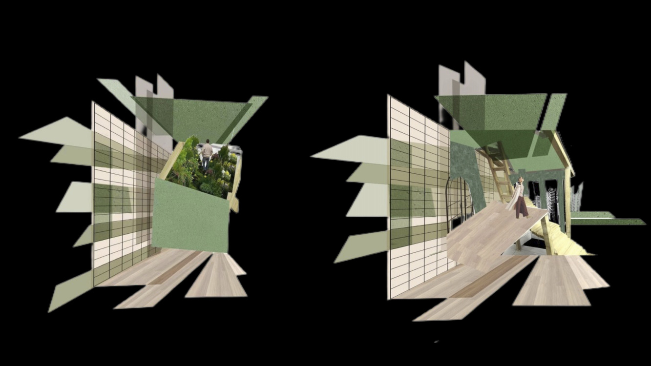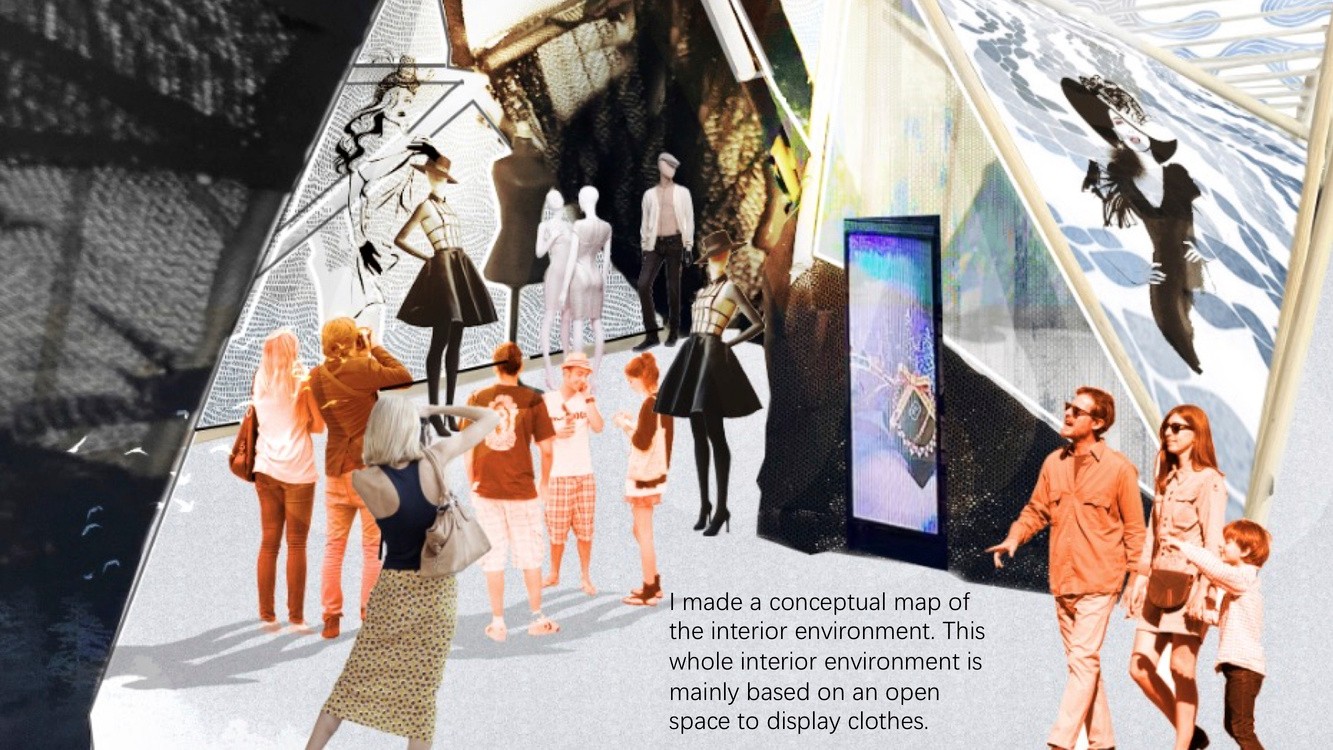 《A sense of distance and belonging》是我為Prada設(shè)計(jì)的一個(gè)快閃店。在建筑整體的構(gòu)建上我參考了Prada服飾的一些廓形和剪裁,運(yùn)用棱角分明的線條和大量的三角體確立了建筑的造型基礎(chǔ),并決定用Prada標(biāo)志性的尼龍面料作為建筑的墻體。同時(shí)我將這個(gè)建筑設(shè)計(jì)為半開(kāi)發(fā)的結(jié)構(gòu),透明玻璃與實(shí)體墻形成對(duì)比,聯(lián)系了一部分的內(nèi)外空間,也為使觀眾帶來(lái)輕松的氛圍。而尼龍布則會(huì)將部分展陳內(nèi)容遮擋,以此增加神秘感,吸引外部觀眾進(jìn)入店內(nèi)探索。
