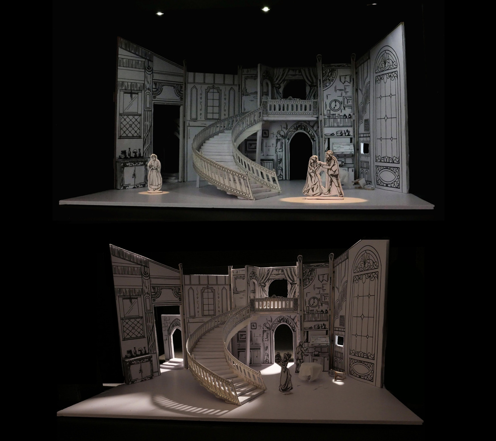 《當(dāng)你老了》這個項(xiàng)目讓我能夠制作不同的場景來展示愛情在各個階段的進(jìn)展:相遇、求婚和老年。 盡管我發(fā)現(xiàn)這個項(xiàng)目對我來說具有挑戰(zhàn)性,但它使我加深了對敘事詩意意象的理解。除了為古典文學(xué)設(shè)計舞臺之外,我還為《愛麗絲夢游仙境》設(shè)計了一個非傳統(tǒng)的舞臺,融入了鮮艷的色彩和鏡子等元素,讓觀眾沉浸在愛麗絲的魔法世界中。此外,在描繪19世紀(jì)女性悲劇《朱莉小姐》的過程中,我加強(qiáng)了塑造白模的技能。通過對細(xì)節(jié)的審視,文本與模型的區(qū)分成為一種旨在對比社會地位的雙層建筑設(shè)計,最終象征著主人公的困境。我的目標(biāo)是通過打造這個經(jīng)典舞臺來強(qiáng)調(diào)女性角色的力量和獨(dú)立