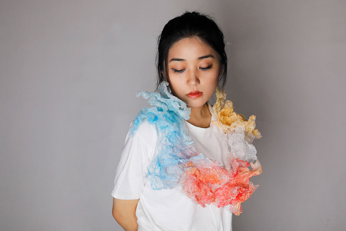I prefer to use found objects as my materials to make narrative jewelleries. I like to hide a long story behind the jewellery because it gives you a view of the hidden beauty. In the work I made about the love of my grandparents, I used their photos and the red rope as the found materials. In the meantime, I also express my feelings to the audience through jewellery, from the missing to my family to the anxiety about the worsening environmental pollution in my hometown. For example, in the work I did this year, I used plastic bags, which are collected from the seaside as the material to simulate the appearance of marine creatures being entangled by plastic. This jewellery design shows the severity of Marine pollution.
