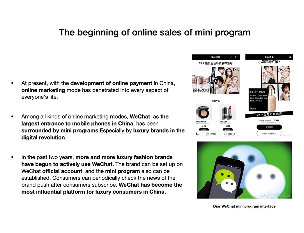 Her research purpose of the <WeChat closed-loop Ecological Marketing Strategy of luxury brands> is to let luxury brands understand customers through WeChat ecosystem and carry out some online promotion and marketing behaviors. I will give comments and suggestions for the current online strategy of the luxury brands and the future online market trend in my paper.
