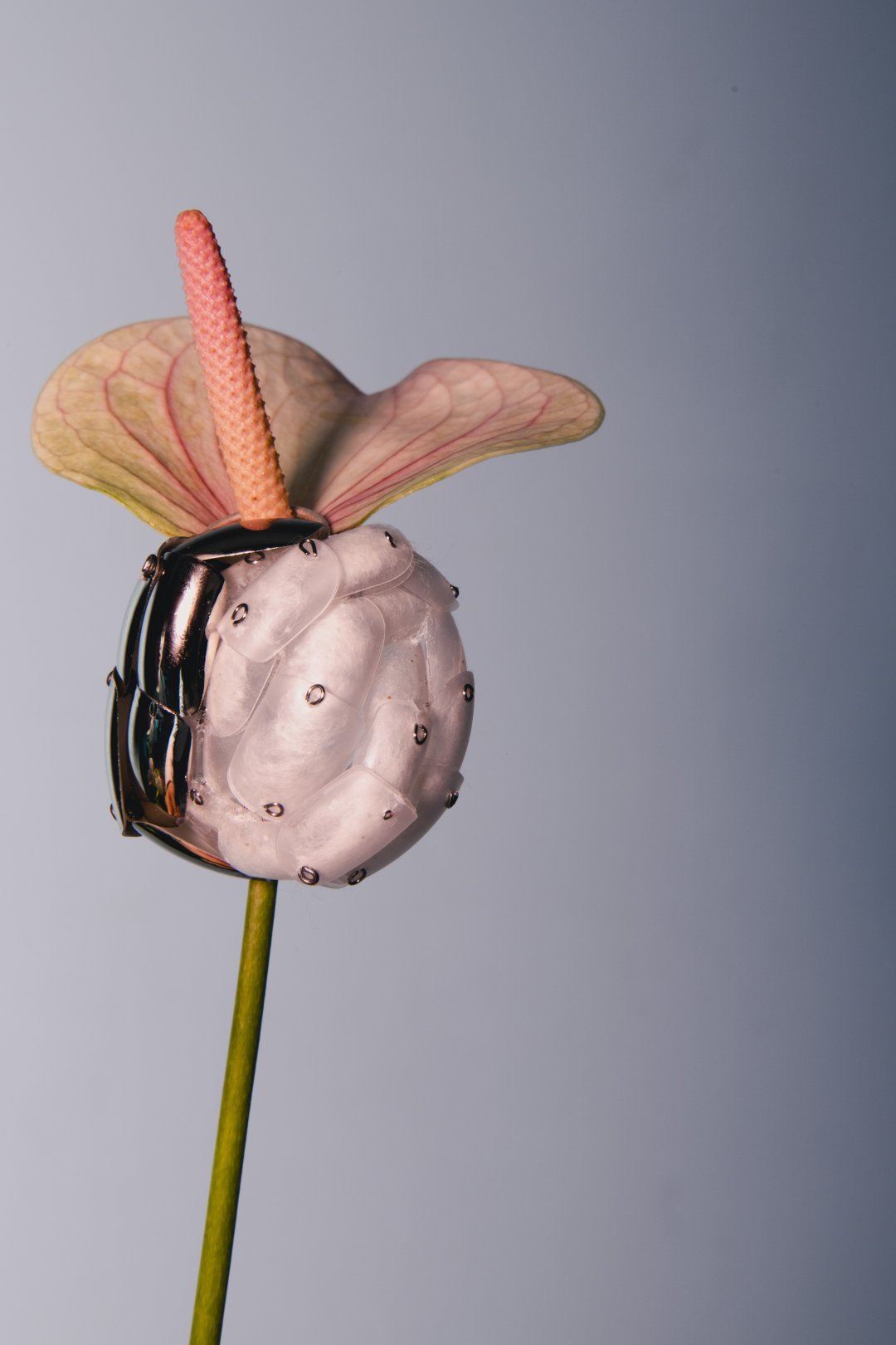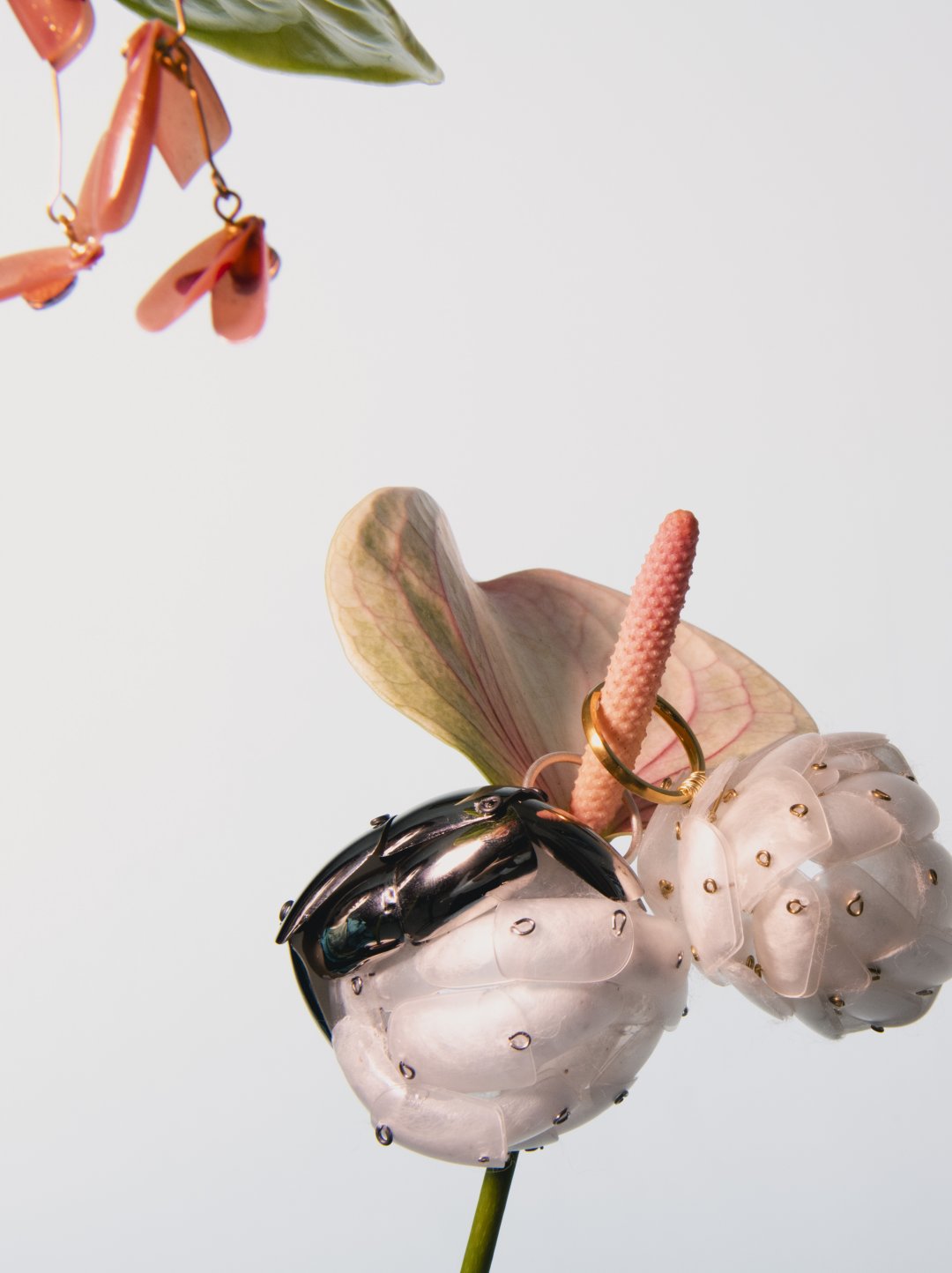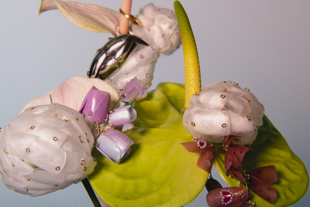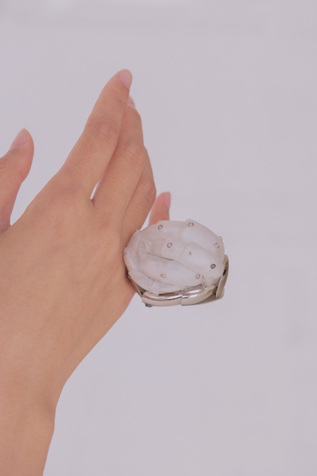 當代首飾的材料的不受限的,在我最近的一個項目里我探索了美甲片應用于首飾的可能性。美甲起初的目的就是為了吸引男性目光,在一部分人眼中,裸露的指甲如同素顏,無法面對公共場所的凝視。我將社交恐懼群體的心理視為一個容器,在從一些自然界現象中聯想到,他們其實就是一個“繭”,在每個“繭”中,你在創造屬于你自己的美麗,你不沖破它永遠不知道里面有什么東西,于是我嘗試用美甲的材料做一個素凈柔軟的繭型,利用顏色和材料質感的對比去表達每個人不同的個性和可能性,希望能鼓勵社交恐懼群體去展示自我。