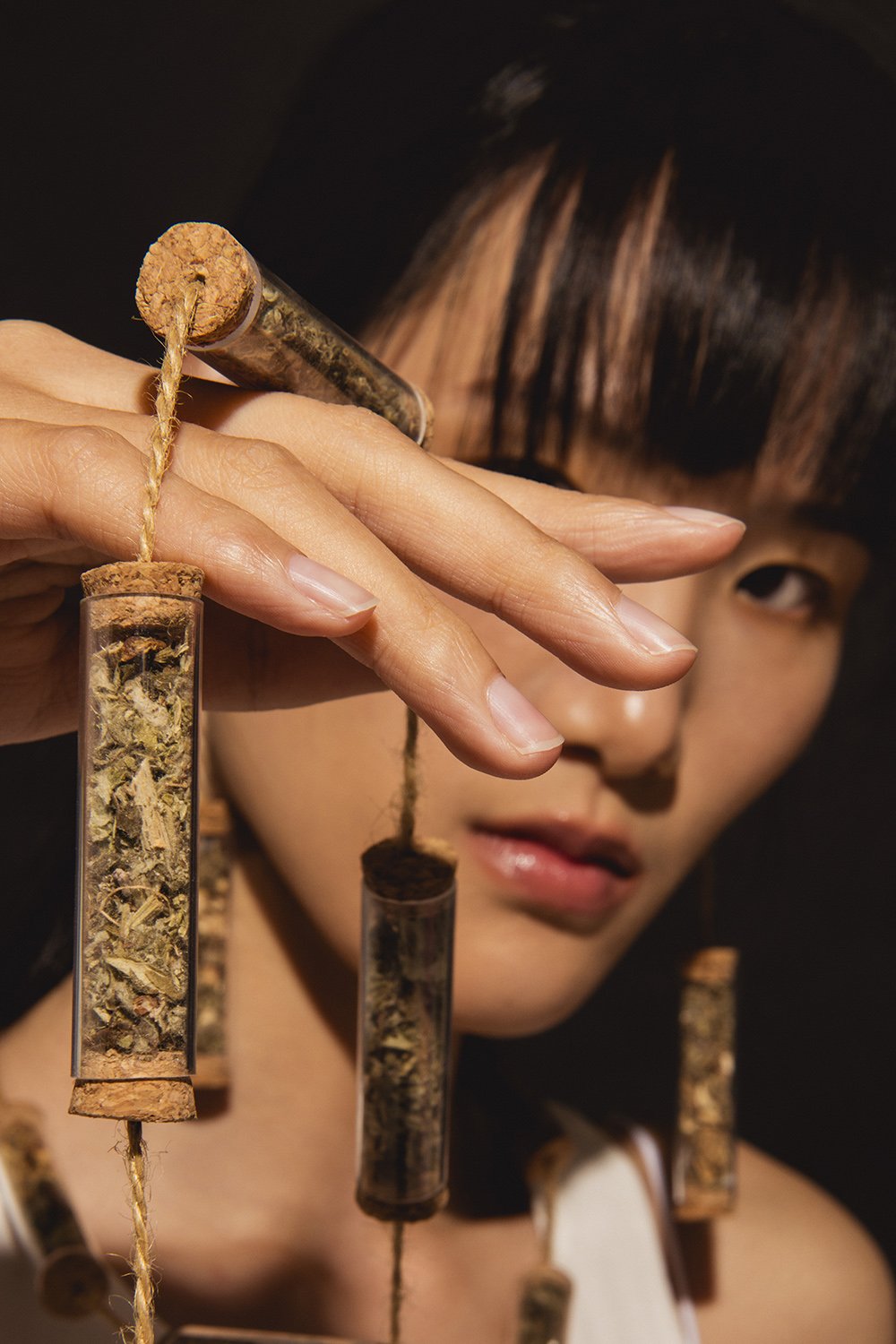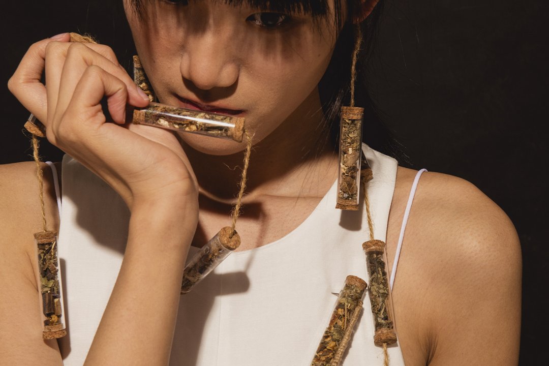 在我的作品《Practical》中,我用亞克力和擁有驅蚊、提神功效的中藥配方做結合,透明的亞克力可以很好突顯出我所運用到的中藥。這是一系列功能性首飾,作品被佩戴后可以很好的聞到首飾內中藥的味道,發揮作用。