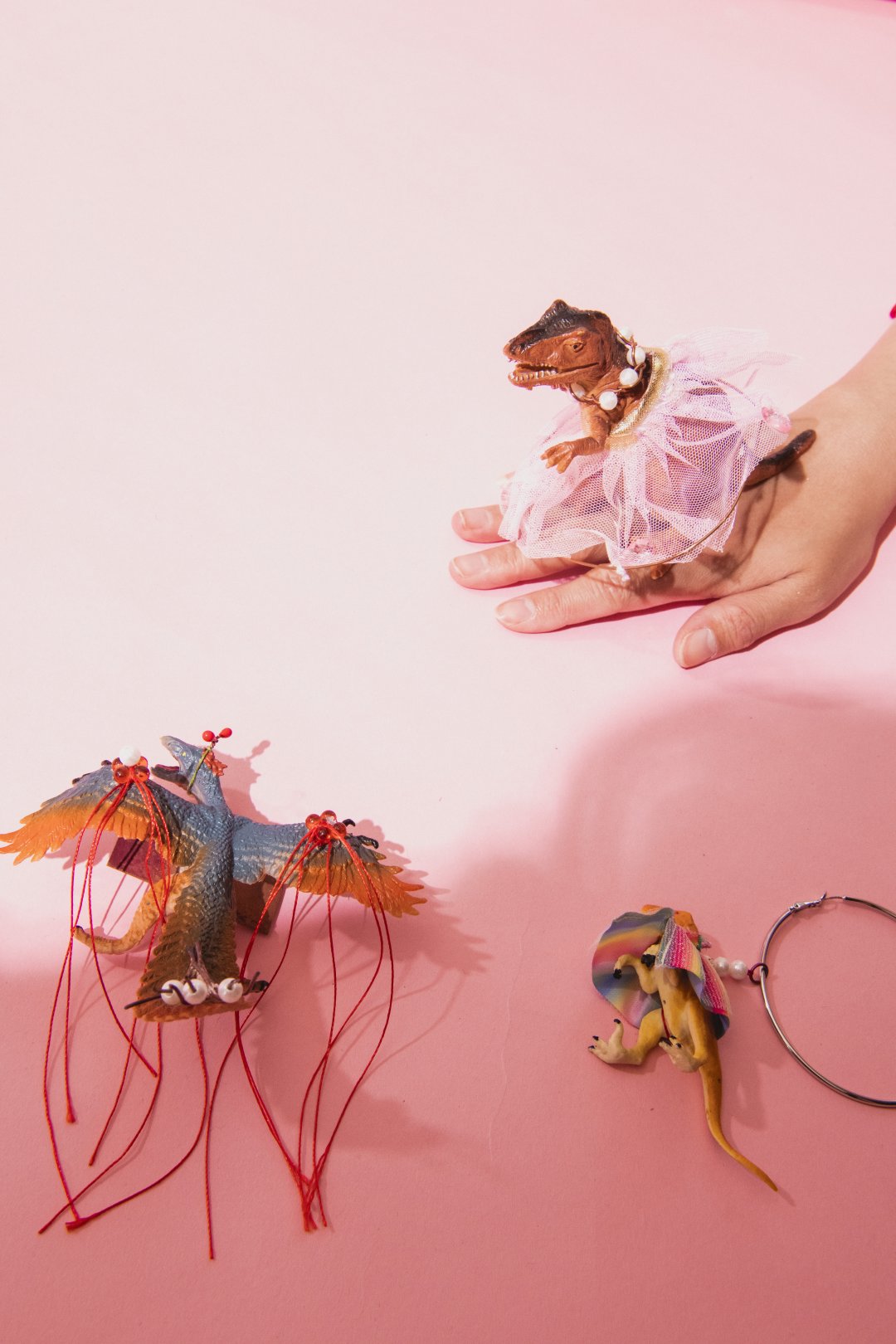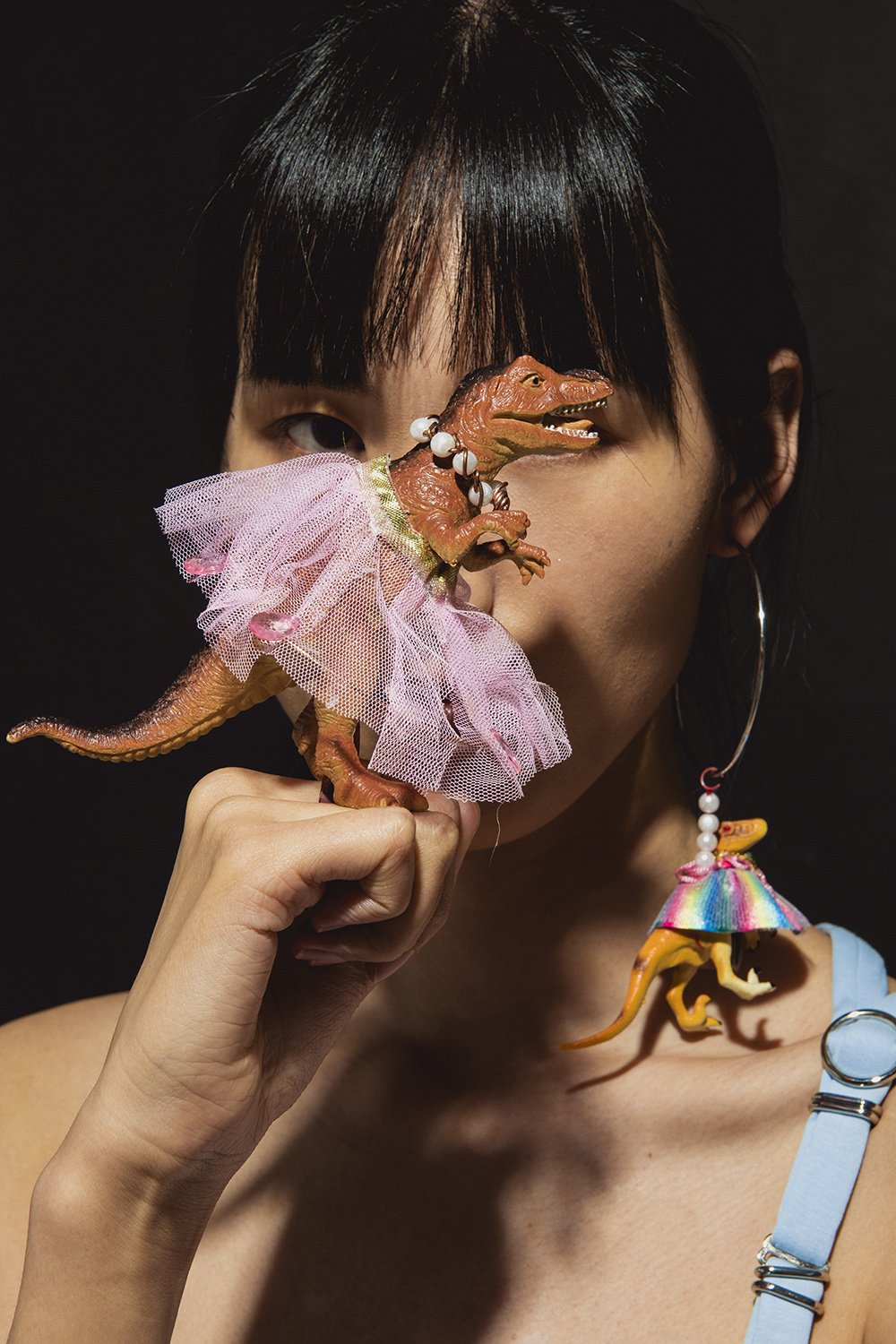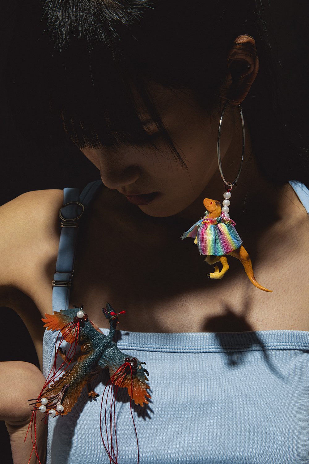 孩子的性別認知基本來自于長輩的引導以及身邊事物的影響,不同的認知過程都可能造成孩子們不同的性別差異。我的第二個作品《Dinosaur in a Skirt》講述了自己的故事,恐龍是我從小最喜歡的玩具,但在大人眼里身為女孩的我應該玩女孩子該玩的玩具,比如娃娃。這一系列首飾通過玩具恐龍穿女性服飾和佩戴珍珠元素的飾品來討論社會對兒童的性別刻板印象,同時引發觀者對兩性平等的思考。