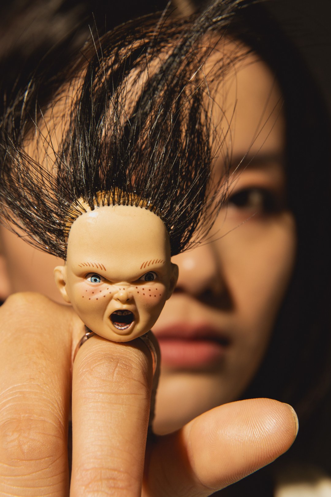 And In the process of testing, I found that a slight perm is especially like gourd moss. So I dyed my hair red And made it into a small pot. Although it's not wearable But I was inspired by this test and fell in love with this way of testing new materials.