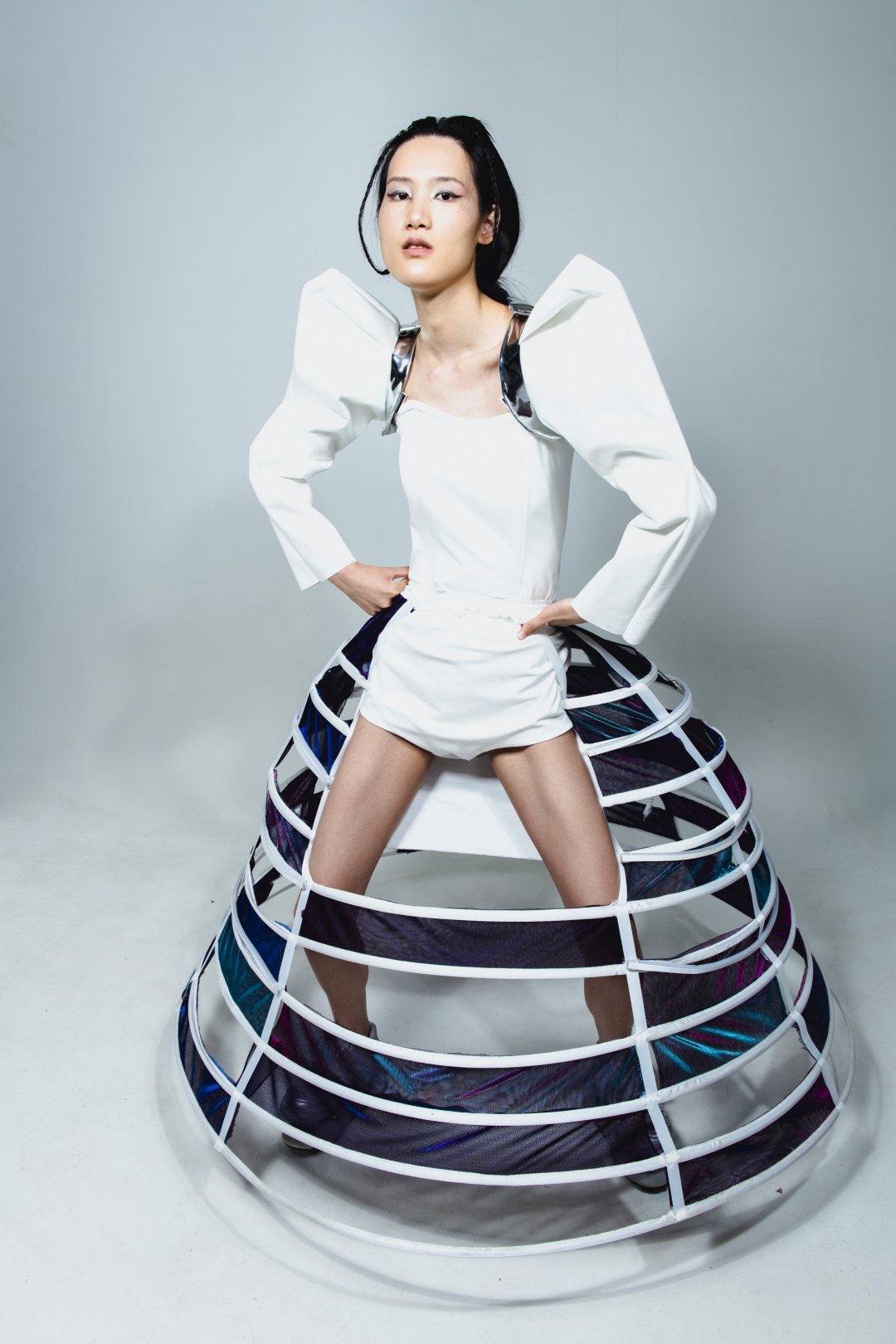 I am a fashion designer and like to decorate every series of works with exaggerated silhouettes and many distinctive fabrics. In the first work Orlando, I want to try the possibility of collision between Rococo style and Cyberpunk elements to show the aesthetic feeling between the two boundaries. The final piece is a ready-made garment with a big skirt. I combined the Rococo style dress of the umbrella skirt with colorful Cyberpunk elements, decorating the skirt body with fresh pastoral patterns and the skirt with bright lights. The collision between them has produced a unique aesthetic feeling.