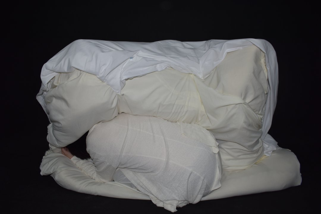 《被子之神》這件作品源自于我對被子的異常迷戀。當(dāng)我對一件物的情感達(dá)到了異于常態(tài)的狀態(tài),物變成了主宰者——神,而我則變?yōu)榱宋锏母綄倨贰_@件作品,闡述我將作品神化的一個(gè)過程。
