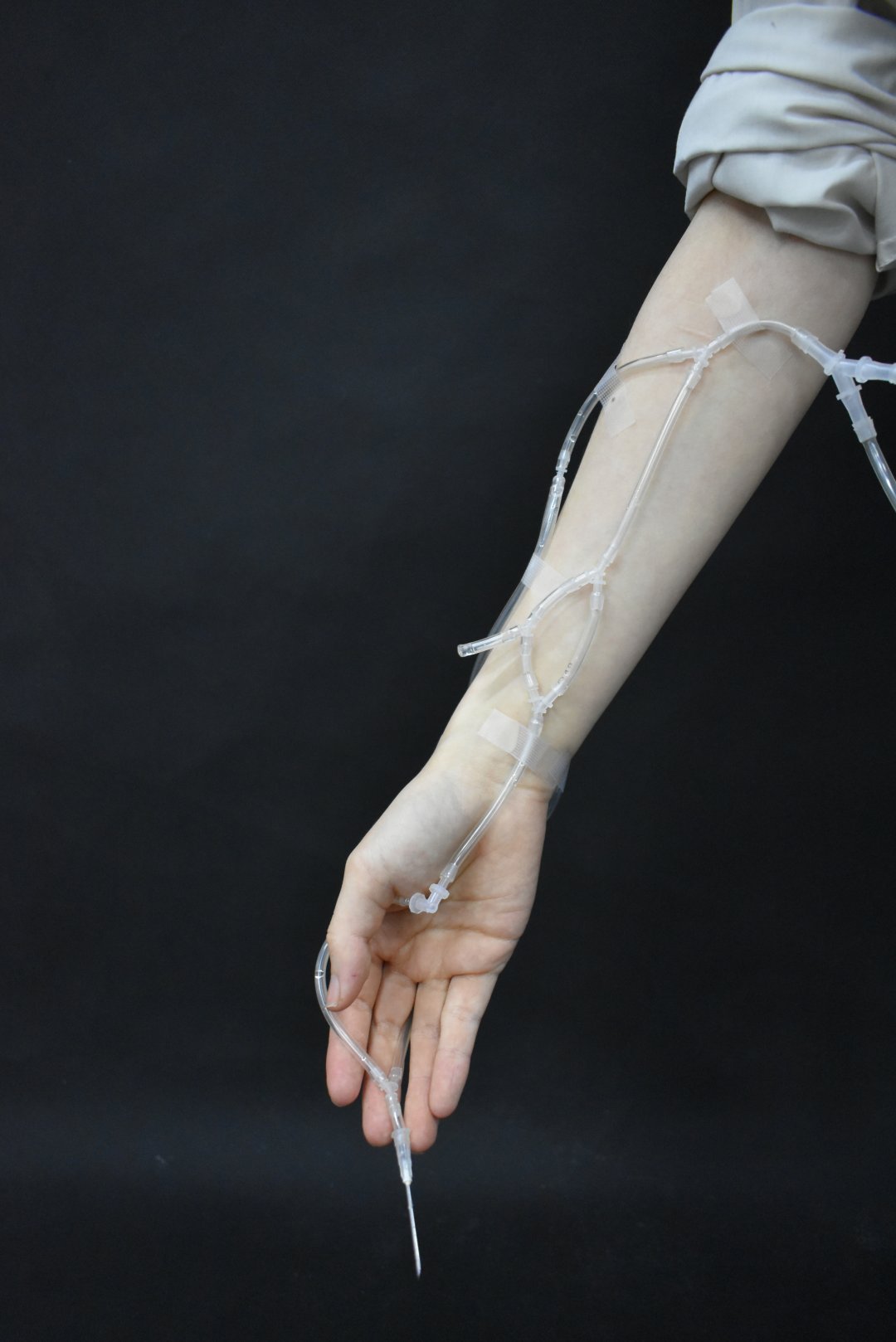 In this project, I use luminous reaction to express the light of the electronic screen. The medical device is used as the main material of the piece. The lumine reagent flows down through the infusion tube around my body, which represents my previous attachment to electronic devices, and the state that I am actually controlled by electronic products.