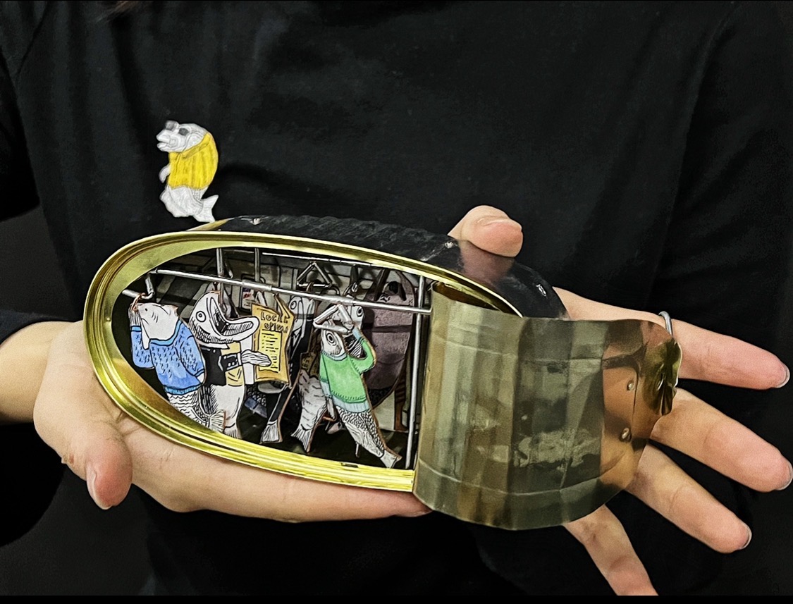 My work sardine Can was inspired by the rush hour subway. To borrow the common metaphor of being packed like sardines, I use the tin as a metaphor for the carriages and the sardines as a metaphor for the passengers. I observed all kinds of passengers in the carriage, and recorded their clothes, appearance, expressions and movements by hand painting. Thus designed a sardine character with different personalities. The sardines are hung from the 'railings of the subway' and can also be removed and worn individually as a brooch.
