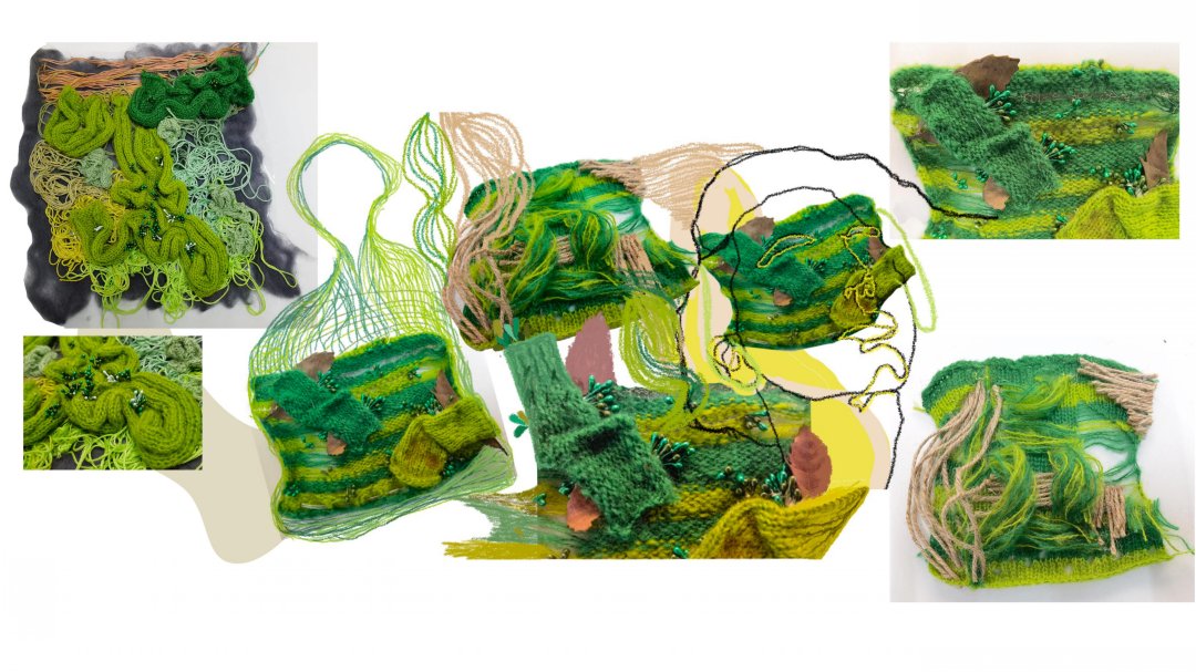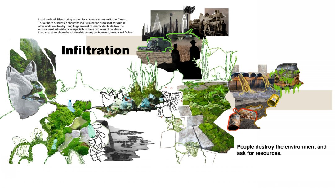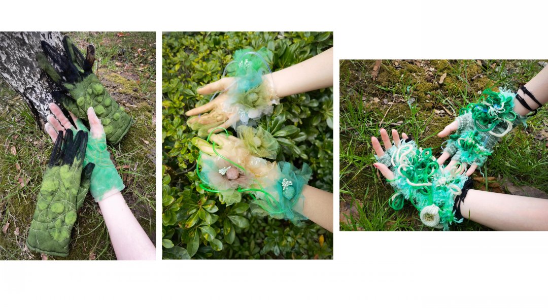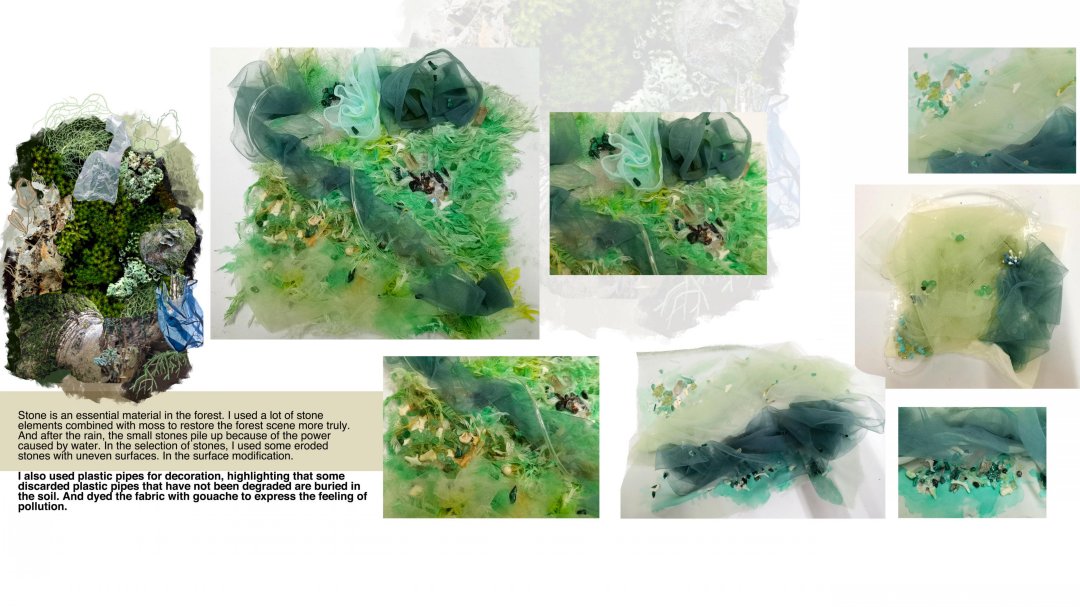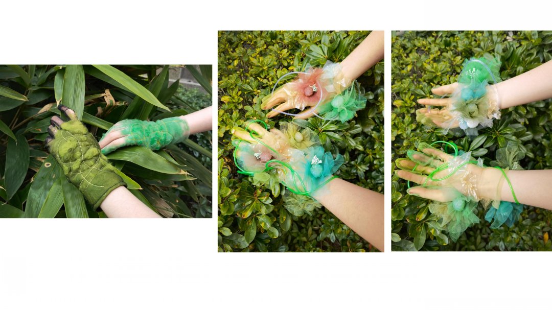 因為家庭的原因,我從小就接觸到了許多面料,因此我對不同的材料的組合產生了濃厚的興趣,環保和可持續的概念也是我在創作設計項目時必不可缺的考慮方面。在作品《滲透》中,我以在森林中的塑料污染現象和《寂靜的春天》這本書為靈感進行面料設計。在這個系列的作品中,我嘗試運用多種非常規材料與傳統面料結合,例如:PVC面料,塑料管,紗,毛線等等,并通過結合多種技術,如針織,滴膠凝固,熱風機融解來體現污染和自然環境互相滲透的主題。最后我設計出了三副手套,以表達所有的污染都是人類親手造成的這一理念,并在自然中拍攝了最后成品的照片和視頻,以表達手和環境無言的對話。