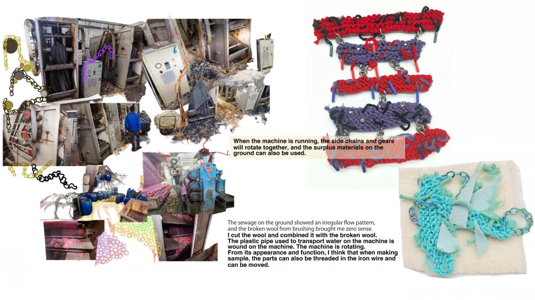 在作品《再生》中,我以在工廠里觀察到的面料浪費現象為靈感,對服裝產業浪費進行了調研,利用工廠收集的廢棄面輔料來進行創作。我從在工廠的一手調研拍攝中提取了面料懸掛、堆積、鎖鏈、機械零件、管道、打包繩、紐扣等元素,結合編織、針織、刺繡等多種工藝進行面料設計,體現出凌亂與規整間的對比、轉換。最后,我把所有面料組合成了一塊大的面料懸掛在了工廠的機器上,我認為這些“不完美”的破損碎片組合起來有種豐富而特別的美感,與灰暗的工廠形成了強烈的對比沖擊。