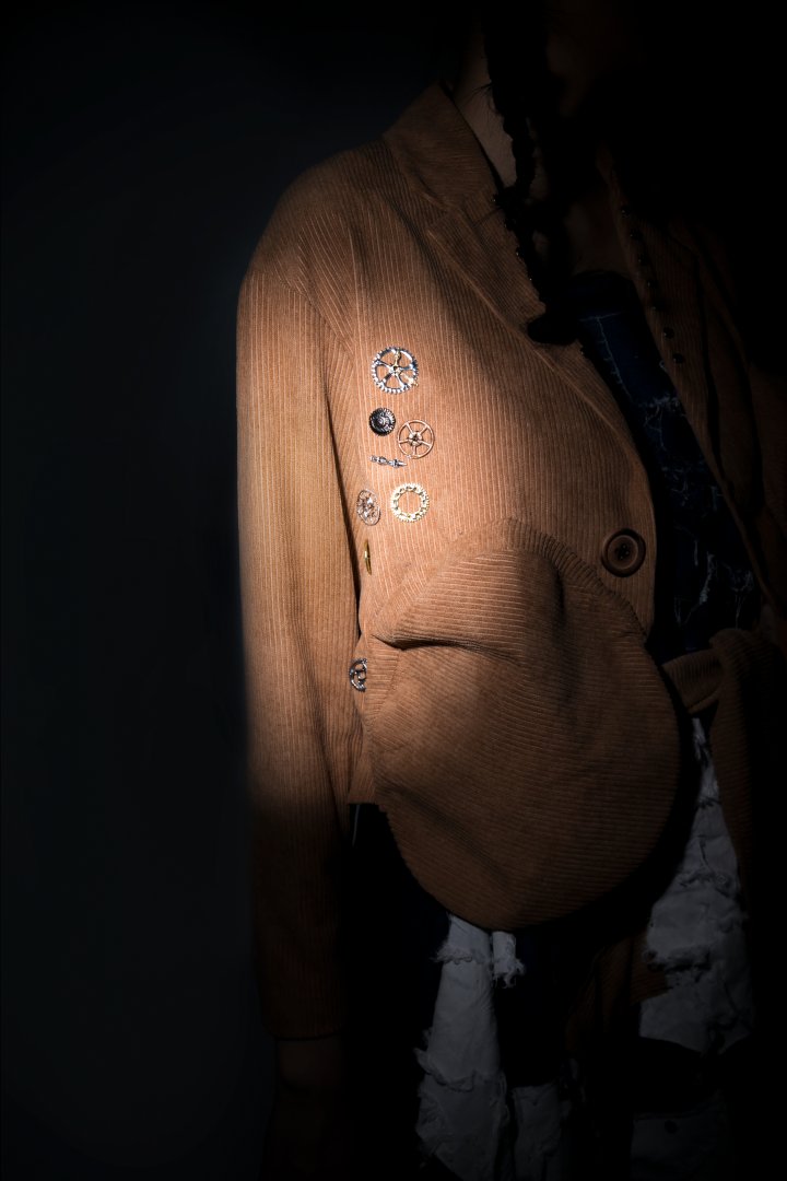 我在設(shè)計(jì)時(shí)注重將設(shè)計(jì)感與服裝的實(shí)穿性結(jié)合,并熱衷于從過去的時(shí)裝中獲得靈感,這一點(diǎn)充分的表現(xiàn)在了我的作品《TIMES》中。這個(gè)系列從黑白電影《摩登時(shí)代》中獲得靈感,該電影以黑色幽默的手法表現(xiàn)了美國經(jīng)濟(jì)大蕭條下工人階級苦苦掙扎的生活狀態(tài)。我對20世紀(jì)30年代美國人們的穿著服裝進(jìn)行了調(diào)研,提取了當(dāng)時(shí)流行的直筒式風(fēng)格的連衣裙,以及電影中資本家干凈整潔的西裝、工人階級破舊不堪滿是油污的背帶褲和牛仔工作服,并結(jié)合電影中大量出現(xiàn)的螺絲,紐扣,齒輪等元素進(jìn)行面料改造。通過火焰噴槍將齒輪,螺絲和紐扣進(jìn)行燃燒,整體呈現(xiàn)出一種復(fù)古而不乏現(xiàn)代休閑感的風(fēng)格。