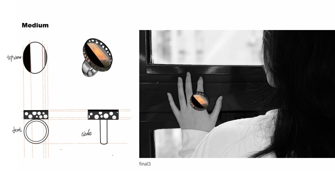 “Media” is a collection of brooches created during quarantine. The window became the only channel for me to approach the outside world. The scenery outside the window evokes my memory of the life before the epidemic. In my work, the colourful sky was hidden by the distorted architectural structure which expresses my feeling of being restricted and my desire for the freedom